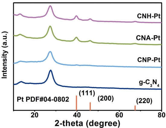 The crystal structures of the samples can be depicted through the X-ray powder diffraction (XRD) pattern, as shown in Figure 1. Pure g-C3N4 shows two characteristic peaks located at around 13.2° and 27.4°, which are attributed to the in-plane ordering of tri-s-triazine units (indexed as (100)) and the interlayer stacking of conjugated aromatic systems (indexed as (002)), respectively [34]. CNH and CNA also show similar diffraction patterns, indicating that high temperature heat treatment does not destroy the crystal structure of g-C3N4 (Figure S1). The diffraction peaks at around 13.2° and 27.4° also appear in the patterns of samples CNH-Pt, CNA-Pt, and CNP-Pt, indicating that g-C3N4 preserve its crystal structure with Pt NPs loaded into it. In addition, weak peaks at 39.7° have been detected in CNH-Pt, CNA-Pt, and CNP-Pt, which are diffraction peaks corresponding to Pt (111) crystal plane [31], which can be concluded that Pt NPs have been loaded onto g-C3N4 by three different methods. Among them, the diffraction peaks of CNH-Pt and CNA-Pt at 39.7° are obvious, which is due to the good crystallinity of Pt obtained by high temperature heat treatment. The diffraction peak of CNP-Pt at 39.7° is weaker, which may be because the photoreduction process is carried out at 10 °C, and the lower temperature makes part of Pt exist in amorphous form and has not been detected. In addition, inductively coupled plasma optical emission spectrometer (ICP-OES) results show that the actual Pt loads concentration of CNH-Pt, CNA-Pt, and CNP-Pt are all about 3 wt% (Table S1).
