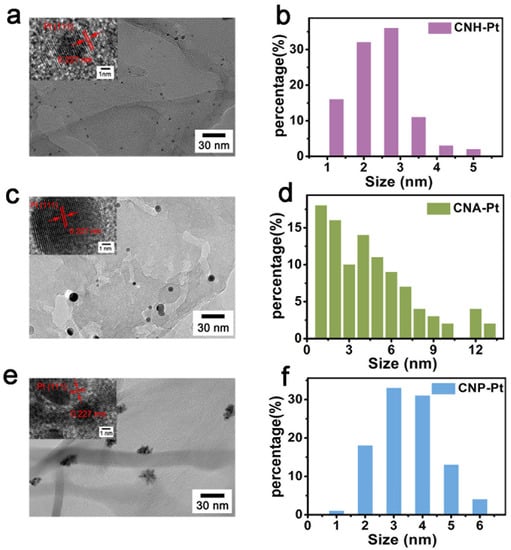 TEM images and Pt NPs size distribution of CNH-Pt (a,b), CNA-Pt (c,d), and CNP-Pt (e,f). Insets show HRTEM images of CNH-Pt (a), CNA-Pt (c), and CNP-Pt (e).