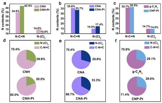 The surface contents of the two N species in different catalysts are depicted in Figure 4a–c, showing no significance difference between CNH, CNA and pure g-C3N4. However, after loading Pt NPs with three different methods, the surface content of the two N species alters significantly, which is caused by Pt NPs selective anchoring on the different N species [31]. Figure 4d–f shows the variation in the proportions of the two N species on the catalyst surface before and after loading Pt NPs. Compared with CNH, the ratio of N-(C)3 in CNH-Pt decrease from 29.6% to 20.0%, indicating that Pt NPs in CNH-Pt are mainly anchored on N-(C)3. N-(C)3 is believed to play an important role in the nucleation and dispersion of noble metal particles, and the Pt particles bound to it have high adsorption energy [32,43]. Therefore, it is less likely to attract a large number of Pt atoms to form large particles, which also explains the high dispersity and relatively small size of Pt NPs in CNH-Pt. The C-N=C decrease from 70.4% in CNA to 66.7% in CNA-Pt, indicating that Pt NPs in CNA-Pt are mainly supported by C-N=C. C-N=C can be used as an anchor point, and the Pt attached to it has a lower adsorption energy [32,43]. It is easier for Pt atoms to coalesce into larger particles, which is consistent with TEM observations of larger Pt NPs in CNA-Pt (Figure 2c). However, comparing with pure g-C3N4, the proportion of N species in CNP-Pt is basically maintained. Pt NPs in CNP-Pt are not selectively connected with N species, resulting in a large number of particles agglomerated together without being dispersed. From the fitting results of the N 1s spectra using three functional groups, the change of Pt deposition to ratio of N-(C)3 and C-N=C follows the same trend with the results using two functional groups, and the C-N-H content hardly changes before and after loading Pt (Figure S4). Therefore, only C-N=C and N-(C)3 will be discussed below.