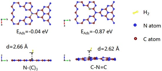 In order to further confirm the selective deposition of Pt NPs on different types of nitrogen in different atmospheres, the adsorption energies of C-N=C and N-(C)3 to hydrogen were calculated using first-principles calculations. As shown in Figure 5, the adsorption energy of C-N=C for hydrogen (−0.87 eV) is much lower than that of N-(C)3 (−0.04 eV). Meanwhile, the adsorption of hydrogen at the C-N=C site causes obvious structural distortion of g-C3N4. As C-N=C is easier to adsorb hydrogen, more Pt NPs in CNH-Pt obtained by heat treatment in argon–hydrogen atmosphere will be adsorbed by N-(C)3. The adsorption capacity of C-N=C to Pt atoms is stronger than that of N-(C)3 [43], so Pt NPs in CNA-Pt obtained by air annealing without the influence of hydrogen are more likely to deposit on the position of C-N=C, which is consistent with XPS test results, confirming the hypothesis of selective deposition of Pt NPs.