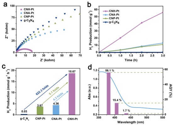 EIS Nyquist plots (a), time course of hydrogen evolution over 3 h (b) and hydrogen production rates (c) of CNH-Pt, CNA-Pt, CNP-Pt, and g-C3N4. (d) Wavelength-dependent AQY and absorption spectrum of CNH-Pt.