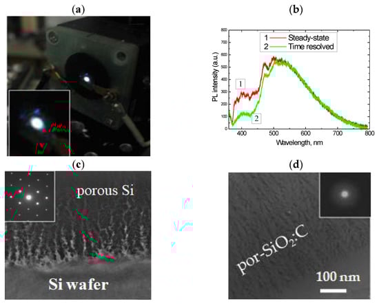 (a) Emission spot of por-SiO2:C layer under 351 nm excitation (Ar+ laser); (b) PL spectra of por-SiO2:C layer measured in steady-state mode and in time-resolved mode; (c,d) TEM image of morphology of the carbonized porous silicon layer before and after wet oxidation. Insets in (c) and (b) represent electron diffraction patterns.