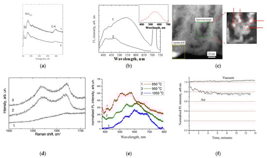 (a) Electron energy loss spectroscopy and (b) PL spectra of por-SiO2:C layer before and after annealing in oxygen at 600 °C (reprinted from ref. []); (c) HRSTEN/EELS image of distribution of carbon inside pore (reprinted from ref. []); (d) Raman scattering spectra of porous silicon carbonized at different temperature: 850 °C (1), 950 °C (2), 1050 °C (3) (reprinted from ref. []); (e) PL spectra of por-SiO2:C samples synthesized using different carbonization temperatures; (f) evolution of PL intensity in por-SiO2:C in time.