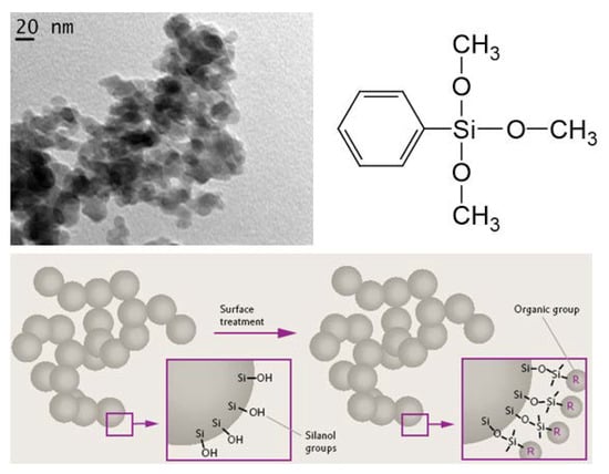 Typical TEM image of the fumed silica used in the research; molecular structure of phenyltrimethoxysilane; and illustration of the chemistry of fumed silica surface modification.