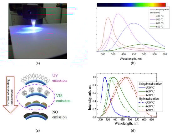 (a)A typical image of the emission of SiO2:C nanopowder under LED excitation (λex = 408 nm, power = 40 mW); (b) PL spectra of “phenyl-silica” after annealing at different temperatures (excitation 250 nm); (c) illustration of the processes of pyrolytical precipitation of carbon on the silica surface; (d) emission spectra of annealed phenyl-silicas with and without surface hydration pretreatment.