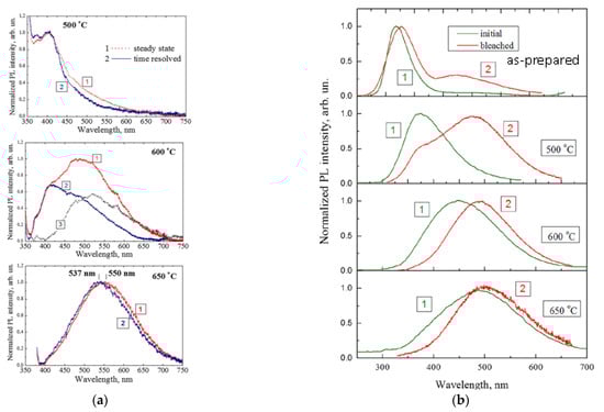 In order to examine the homogeneity of the emission spectra of SiO2:C nanopowder with respect to the PL response, the samples were examined by time-resolved PL spectroscopy, under excitation with a 337 nm N2 pulse laser [], by means of comparison the with por-SiO2:C described in the previous section. It can be seen from Figure 6a that the steady-state and time-resolved spectra of the samples annealed at 500 °C and 650 °C were almost identical, indicating good homogeneity of the ensemble of emitters with respect to the PL response time. In contrast, PL band of the sample annealed at 600 °C exhibited strong inhomogeneity with almost equal contribution from the “fast” and “slow” centers. Subtracting the time-resolved spectrum from the steady-state yielded a spectral distribution similar to that of the sample annealed at 650 °C (spectrum 3 in Figure 6a). From such comparisons, it can be suggested that the emission band of this sample was composed of at list two components corresponding to emission centers that had a structural nature similar to those that were dominant in the samples annealed at 500 °C and 650 °C. In summary, such experiments demonstrated the multiband nature of PL in SIO2:C nanopowders.
