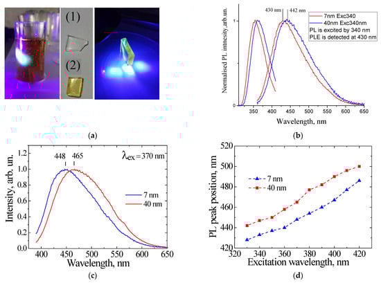 Two approaches were implemented for preparing luminescent porous SiO2:C samples. First, the thermolysis of sucrose in DMSO solution was performed at temperatures of 170–180 °C, resulting in a dark brown dispersion with strong visible PL (Figure 7a). the infiltration of porous silicon oxide with the luminescent dispersion was carried out by immersing the sample in the dispersion for 24 h, followed by drying. After this procedure, the sample acquired a uniform light brown color and showed intense visible PL (see Figure 7a). To study the effect of the size of CNDs on their PL properties, the porous silica samples were immersed into water for 24 h, resulting in light brown luminescent dispersion. The idea of the experiment was that the average size of the CNDs that penetrated into the porous matrix would be proportional to the pore size of the matrix. Figure 7b shows the emission and PL excitation spectra of CNDs extracted from porous samples with pore sizes of 7 nm and 40 nm. It can be seen that emission and excitation bands were low-energy shifted as the pore size increased from 7 to 40 nm. A similar pore size effect was observed in CNDs synthesized in a porous matrix using citric acid as a carbon precursor [].