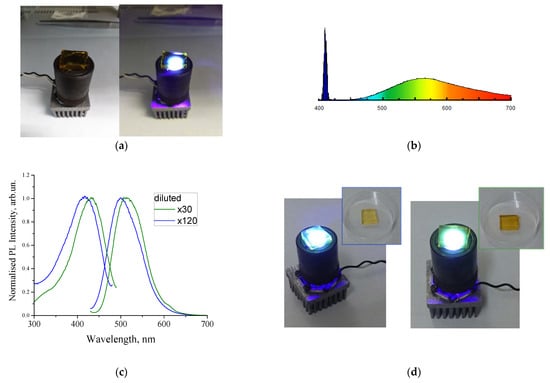 Figure 8c represents the emission and excitation spectra of dispersions with a concentration that differed by a factor of four. With the increasing of the concentration of CNDs in the dispersion, a noticeable long-wavelength shift was observed. The emission spectra were measured at the same excitation wavelength, so the spectral shift referred solely to the concentration effect. The concentration effect could be associated with both the effect of aggregation in the dispersion and with the effect of the secondary absorption of PL radiation in the phosphor layer. This effect is currently being investigated in more detail. However, it is worth noting that it was possible to tune the spectral properties by changing the concentrations of the emitters. Dispersions of these CNDs were used to infiltrate porous silica samples according to the procedure described in the previous paragraph. The photo in Figure 8d illustrates the emission from CNDs infiltrated by CND dispersion at different concentrations. Regardless of the mechanism of the spectral shift, this observation suggests the possibility of controlling the color tone of white radiation using the concentration of CNDs.