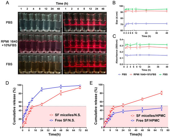 From Figure 2A, the stability of SF micelles was evaluated in different mediums including 0.01 M PBS, RPM1640 + 10% FBS, and FBS, respectively. The particle size results measured by DLS showed that micelles could be stable for at least 48 h in all three media, while the particle size measured in RPM1640 + 10% FBS and FBS media was larger than that measured in PBS, which might be due to the protein crown formed by FBS on the particle surface, thus we further used the previously reported method to assess the agglomeration of particles in the presence of FBS by measuring the absorbance of micelles in different media at 560 nm [39,40,41,42]. The results indicated that the SF micelles remained good stability in both PBS and serum-containing PBS buffer (Figure 2C).