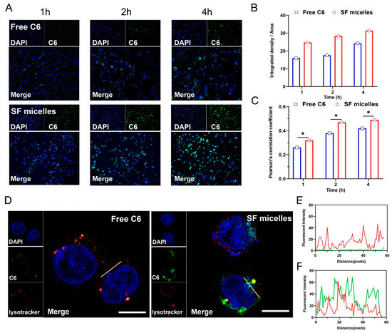 Interaction between SF micelles and TC-1 cells. (A) Fluorescent microscopic photographs of TC-1 cells after 1 h, 2 h or 4 h incubation with Free C6 and C6-labeled SF micelles (green). The nucleus was stained with DAPI (blue). (B) The Average fluorescence intensity (fluorescence intensity/Area) and (C) corresponding co-localization profiles of photographs in Figure A were calculated by Image J software (The Pearson’s correlation coefficient represents the co-localization between the nucleus (blue) and Free C6 and SF micelles (green). Higher values represent a stronger degree of co-location). (D) Representative intracellular localization images of C6-labeled SF micelles incubated with TC-1 cells with 4 h. The lysosomes stained by Lysotracker were red and the nucleus stained by DAPI were blue. The bar is 20 μm. (E) The corresponding co-localization profiles of Free C6 and (F) SF micelles in Figure D were calculated by Image J software. The red line stood for lysosomes, and the green line stood for micelles. Significance criteria: * p < 0.05.