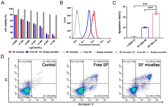 Cellular uptake and cytotoxicity in TC-1 cells. (A) In vitro cytotoxicity of Free SF, Empty micelles, or SF micelles after 24 h of co-incubation in TC-1 cells (n = 3, mean ± SD). (B) Flow cytometry analysis on the fluorescent intensity of cells after co-incubation for 4 h with Free SF and C6-labeled Empty micelles or SF micelles. (C) Cell apoptosis were measure by flow cytometry with Annexin V-FITC and propidium iodide (PI) staining after co-incubation with Free SF, Empty micelles, or SF micelles in TC-1 cells (n = 3, mean ± SD). (D) Typical apoptotic cell images. Significance criteria: *** p < 0.001.