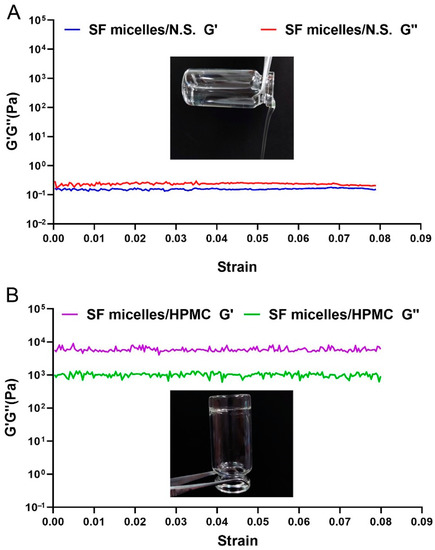HPMC was added to the SF micelles to a mass fraction of 5% and then took 1 mL and placed it directly under the rotor (this process should be done as slowly as possible to avoid bubbles in the sample, and extra sample could be scraped off using a flat scraper) and tested for elastic (G′) and viscous modulus (G″) by rheology (Bohlin Gemini 2, Malvern Panalytical, Malvern, UK). The parameters were as follows: Mode: oscilllation, Temperature: 25 °C, Frequency: 1 Hz, Measuring System: PP40 Acrylic, the correlation curves of G′ and G″ vs. strain were obtained at the end of the measurement.