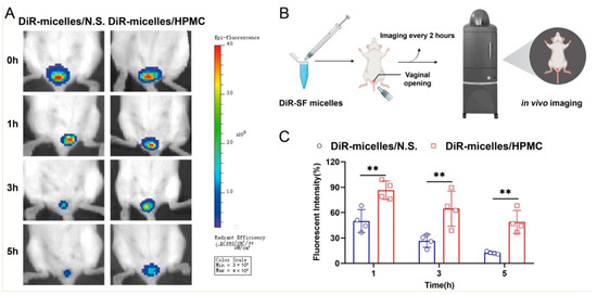 In vivo vaginal retention of SF micelles/N.S. or SF micelles/HPMC after vaginal administration of DiR-labelled SF micelles/N.S. (DiR-micelles/N.S.) or DiR-labelled SF micelles/HPMC (DiR-micelles/ HPMC): (A) Fluorescent images. (B) Schematic diagram of the experimental process. (C) Semi-quantitative fluorescent intensity (n = 4, mean ± SD). Significance criteria: ** p < 0.01.