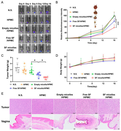 It was reported that the orthotopic TC-1 model strictly represents the cervicovaginal cancer in a short time [48]. The bioluminescence images of tumor-bearing mice were shown in Figure A5 and Figure 7, and there was a near linear correlation between bioluminescence signal and tumor weight as reported [49,50,51], indicating that the bioluminescence TC-1 tumor model could accurately assess tumor size. On the 16th day after intravaginal administration, the bioluminescence intensity of the N.S., HPMC and Empty micelles/HPMC was approximately 155, 156 and 160 times higher than that at day 0 (Figure 7A,B), respectively, with no significant difference between the three groups. The bioluminescence intensity of the Free SF/HPMC group was about 120 times higher than that at day 0, while SF micelles/HPMC was about 76 times higher than that at day 0. The average tumor weight of SF micelles/HPMC was 1.27 g (Figure 7C), the inhibition rate of tumor weight was 72.77% (Figure A7), and the tumor photographs showed that SF micelles/HPMC had a better tumor shrinkage effect than the Free SF/HPMC (Figure A6). These results indicated that SF micelles/HPMC inhibited tumor growth to the highest extent. There was no significant difference in body weight for all groups (Figure 7D). No obvious difference was observed in H&E stained-section of major organs among all groups (Figure A8), H&E stained sections of the vagina in the Free SF group showed that the mucosal epithelium was destroyed, while the mucosal structure in the SF micelles group was intact (Figure 7E), indicating that SF micelles had no significant toxic side effects. All data indicated that SF micelles could safely and effectively inhibit tumor growth.