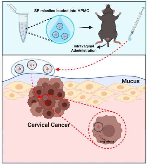 Treatment of sorafinib micelles dispersed in HPMC after intravaginal administration in an orthotopic mouse cervicovaginal cancer model. Created with BioRender (https://biorender.com/).