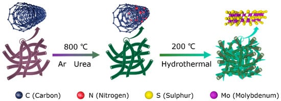 CNTs were purchased from Shenzhen Nanotech Port Co. Ltd., Shanghai, China. All chemical reagents were analytical-grade and directly used without further refinement. Thioacetamide (TAA), molybdenum trioxide (MoO3), and urea (CH4N2O) were purchased from Aladdin Industrial Corporation, Shanghai, China.