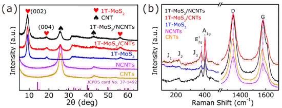 The crystalline structure of the as-fabricated products was characterized by XRD. Figure 2a shows the XRD patterns of the CNTs, NCNTs, 1T-MoS2, 1T-MoS2/NCNTs, and 1T-MoS2/CNTs. It can be observed that the CNTs and NCNTs have two strong peaks at 25.8° and 42.9°. There was no obvious diffraction shift after doping with N. Meanwhile, the peak at 9.6° lower than 2H MoS2 14.4° (JCPDS card No. 37-1492) is attributed to the (002) plane of 1T-MoS2/NCNTs, 1T-MoS2, and 1T-MoS2/CNTs, corresponding to the d-spacing of 0.93 nm, which may be attributed to the intercalation of from urea during the hydrothermal process [25,26,27,28,29]. In addition, there are obviously sharp and broader diffraction peaks among 1T-MoS2, 1T-MoS2/CNTs, and 1T-MoS2/NCNTs, demonstrating the nanoscale of the 1T-MoS2 crystallites in all samples. The Raman spectra (Figure 2b) of the as-prepared samples show two characteristic peaks at 378.4 and 401.4 cm−1 attributed to the and A1g vibrational modes attributed to MoS2 which can be observed from the as-prepared samples. The presence of the J1 (149 cm−1), J2 (221 cm−1), and J3 (335 cm−1) peaks in the lower frequency region is attributed to the vibrational modes of the 1T-phase MoS2 [34,35]. Furthermore, there exist two distinct peaks at 1346 and 1575 cm−1 in the CNTs materials and at 1340 and 1569 cm−1 in the NCNTs materials, consisting of the D and G bands of carbon, respectively. The peak intensity ratio ID/IG in NCNTs (1.2) is higher than that in CNTs (1.14), indicating the presence of more defects and disordered carbon framework after N-doping [30,31,32,36].