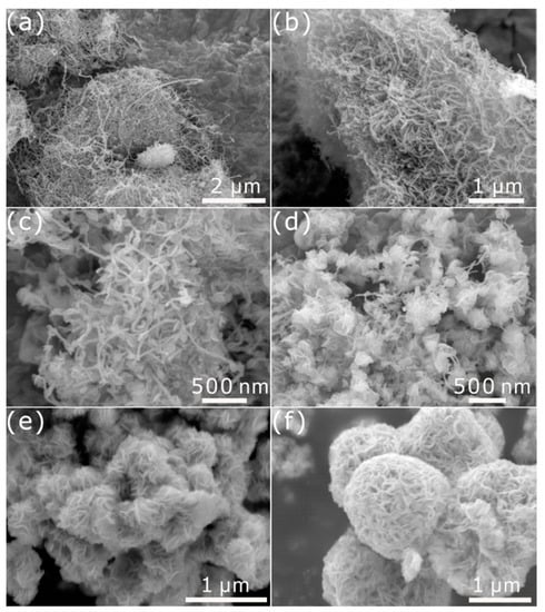 SEM images of (a) the CNTs, (b) NCNTs, (c) 1T-MoS2/CNTs, (d) 1T-MoS2/NCNTs, and (e,f) 1T-MoS2 nanoflowers.