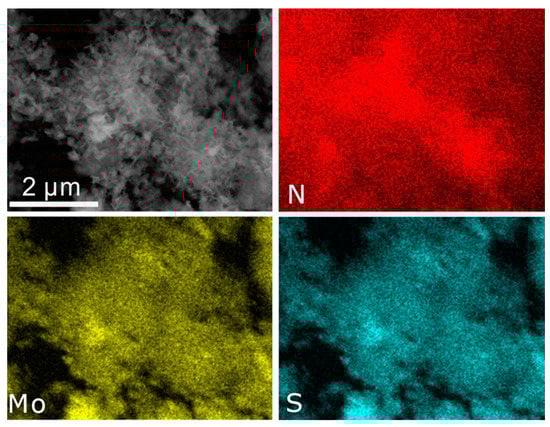 The morphology of the as-prepared samples was characterized by SEM, as shown in Figure 3. Figure 3a,b show the SEM images of the CNTs and NCNTs. CNTs distributed in a random direction. After the CNTs were doped with N, the morphology of the NCNTs was similar to that of CNTs. Additionally, it can be observed that 1T-MoS2 nanosheets distributed on the CNTs without clear agglomeration (Figure 3c). Meanwhile, the multilayer 1T-MoS2 nanosheets assembled on the CNTs well. It is worth noting that the number of 1T-MoS2 nanosheets assembled on the NCNTs is apparently higher than that on the CNTs (Figure 3d), which may indicate improved anchoring of the 1T-MoS2 nanosheets on CNTs after N-doping. Additionally, the 1T-MoS2 nanosheets growing uniformly on the NCNTs could provide great electronic conductivity between 1T-MoS2 nanosheets and NCNTs and could also expose numerous active sites, promoting HER performance. What is more, the 1T-MoS2 nanosheets in nanoflowers (Figure 3e–f) agglomerated together, which thwarted the exposure of active sites on the basal plane and edges. Moreover, the EDS elemental mapping images shown in Figure 4 indicate the existence of N, and it can be observed that the elements Mo and S in the 1T-MoS2 nanosheets are distributed uniformly.