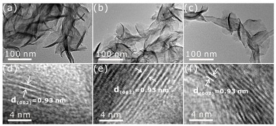 TEM images (Figure 5a,d) show that the 1T-MoS2 nanoflowers have a chaotic nanosheet arrangement, and the lattice spacing is 0.93 nm, corresponding to the (002) lattice plane. Furthermore, it is worth noting that the TEM images (Figure 5b,e) of the as-prepared 1T-MoS2 nanosheets anchored on NCNTs show a large lattice spacing of 0.93 nm ascribed to the (002) plane, similar to the lattice spacing observed in the 1T-MoS2/CNTs (Figure 5c,f). The large lattice spacing may be attributed to the intercalation of from urea during the hydrothermal process [37,38].