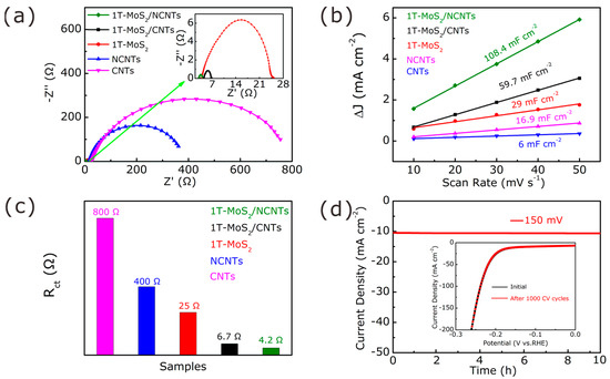 (a) EIS plots of as-prepared samples; (b) ECSA of 1T-MoS2/NCNT, 1T-MoS2/CNT, 1T-MoS2, CNTs, and NCNTs in 0.5 M H2SO4; (c) comparison of RCT; (d) long-time chronoamperometric test performance at an overpotential of 150 mV. Inset illustrates initial LSV compared to curve after 1000 cycles.