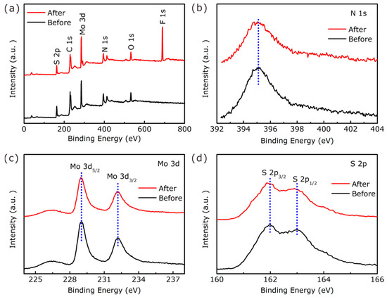 Full-scan XPS spectra (a) and N 1s (b), Mo 3d (c), and S 2p (d) core-level spectra of fresh and spent electrocatalysts.