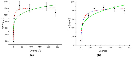 ) for Ofloxacin (OFL) on (a) MIL-100 and (b) Fe3O4@MIL-100_H. (Experimental conditions: MOF 10 mg, 20 mL OFL solution from 10 to 293 mg L−1; RDS ≤ 10%).