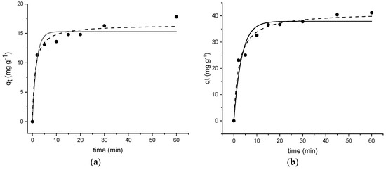 ) for OFL on (a) MIL-100 and (b) Fe3O4@MIL-100_H (Experimental conditions: MOF 20 mg, 40 mL tap water, OFL initial concentration 20 mg L−1; RDS ≤ 10%).