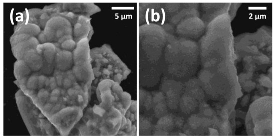SEM image showing morphology of the nanopowders of LiAl(IO3)4 at two different magnifications. White bars in the figures indicate the scale, respectively (a) 5 µm, and (b) 2 μm.