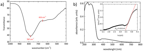 (a) FTIR transmission spectrum of nanocrystalline LiAl(IO3)4 in the 1000–400 cm−1 range; (b) UV-Vis absorption spectrum. The inset in (b) shows the determination of the band gap Egap by means of a Tauc plot of the absorbance of LiAl(IO3)4 (indirect band gap).