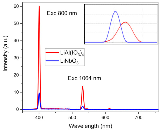 Finally, because of the non-centrosymmetric space group P21 derived above, SHG properties were expected for LiAl(IO3)4. To get a rapid insight of its SHG efficiency, a suspension was initially prepared at 1 g/L, after sonication of the raw powder in ethanol. After sedimentation for 10 h, drying and weighing of the larger aggregates that had settled down allowed an estimation of the final mass concentration at 0.7 g/L within the supernatant. The corresponding DLS size distribution in intensity is indicated in the inset of Figure 6. The mean size centered at ~255 nm, together with a relatively high PDI value at 0.22, indicated the presence of remaining aggregates whose hydrodynamic diameters were significantly larger than the 23 nm XRD crystallite size derived above. For comparison, a colloidal suspension of LiNbO3 nanocrystals, of mean DLS at 120 nm and small PDI value at 0.09, was also prepared at 1 g/L in ethanol. The corresponding mean XRD size at ~30 nm and the synthesis method are described elsewhere [49]. Both suspensions containing LiNbO3 and LiAl(IO3)4 nanocrystals of similar XRD mean size and mass concentration were prepared with the aim of obtaining a rapid comparison of their SHG conversion efficiencies from Second Harmonic (SH) spectroscopy, with the setup fully described in Ref. [50]. Here, for two excitation wavelengths arbitrarily fixed at 800 nm and 1064 nm, the scattered SH intensities are plotted in Figure 6 for the same experimental parameters in the excitation and detection arms. Interestingly, the SHG response of the LiAl(IO3)4 nanocrystal suspension was found to be above that of the reference LiNbO3 material. At this stage, because of the partial aggregation state within the LiAl(IO3)4 nanocrystal suspension and the eventual presence of a broad size dispersion that would require further TEM imaging, a quantitative assessment of the orientation-averaged second-order susceptibility was difficult to achieve, although promising NLO performances were clearly demonstrated for the iodate modification.