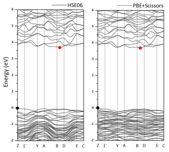 Band structure of LiAl(IO3)4, as calculated by HDE06 (left) and PBE with the scissor parameter (right). The red and the black dots represent the top of the valence band and the bottom of the conduction band, respectively.