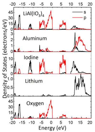 The projected density of the states of LiAl(IO3)4 (PDOS) is shown in Figure 8. The valence band of LiAl(IO3)4 can be divided into two regions with respect to energy. The first region is in the range of −20 to −10 eV, where the bands are attributed to the I s states mixed with some O s states, corresponding to a short, strong covalent I–O bond. Contributions of the s and p orbitals of Al are weak in the second energy region, from −7 to 0 eV, since it is dominated instead by the p orbitals of I and O, with the latter being the main contribution to the top of the valence band. The bottom of the conduction band, in the range of 0 to 10 eV, is mainly dominated by the p orbitals of the iodine atom, with a negligible contribution of the s and p orbitals of the Al and O p states.