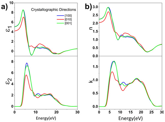 We also studied the linear optical properties of LiAl(IO3)4, calculating the complex relative permittivity . The curves of the dielectric function of LiAl(IO3)4 as a function of the photon energy along the main crystallographic axes, [100], [010], and [001], are shown in Figure 9a. The scissor correction was also added in the computation of optical properties, to avoid underestimation of the band gap due to PBE.