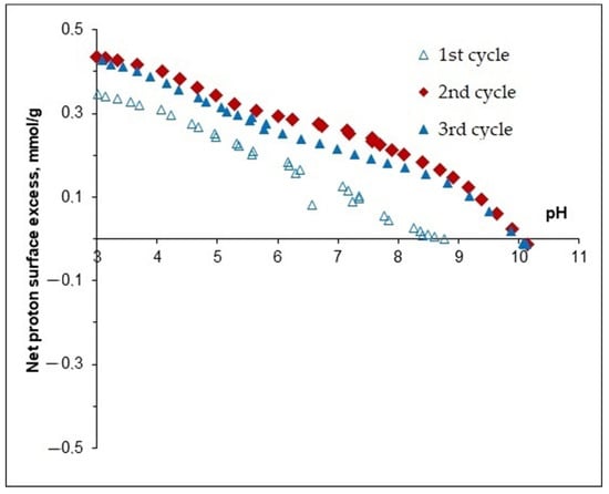 Below pH~3 and above pH~10.5, the dissolution of metal oxides may occur. The solubility of magnetite, owing to its Fe (II) content, is usually higher than that of pure Fe (III) oxides. Nevertheless, the concentration of dissolved Fe (III) species is small (i.e., not greater than ~10−5 mol/dm3 within pH range from ~4 to ~10 [44]), and, thus, the dissolution of particles can be ignored within the titration pH range.