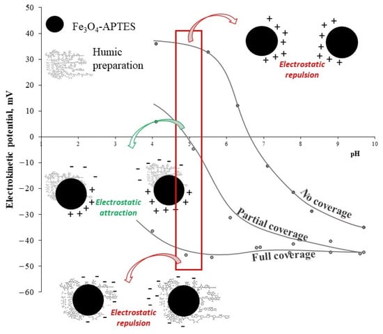 Under specific concentrations, the HP can entirely cover the MNP surface (Figure S1). According to [43], humic preparations have a negative charge in the entire pH range studied here. The adsorption of a negatively charged polyanionic humic preparation on MNPs leads to a recharging of the acidic region surface, from positive to negative; negative charges on nanoparticles gradually become predominant. The attainment of a negative surface charge in the entire pH range (i.e., 3–10) indicates the complete coverage of the HP surface by the humic preparation (Figure 4). The maximum value of negative zeta potential achievable with an increase in HP concentration is about −40 mV.
