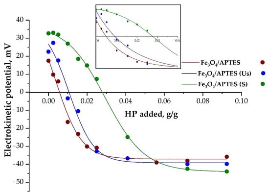As can be appreciated in Figure 6, the addition of a specific amount of HP led to a decrease in zeta potential to zero (i.e., the MNP surface charge was fully neutralized). The HP amounts required to reach this specific state of NPs were definitely different, especially for the Fe3O4/APTES (S) sample.