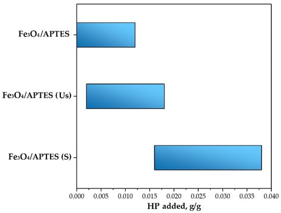 The content of HP was increased, to achieve entirely covered MNPs. The influence of different HP content is presented in Figure S1, considering different ratios of HP vs. Fe3O4/APTES, namely 0.0077–0.1161 g/g (Figure S1 in Supplementary Materials).