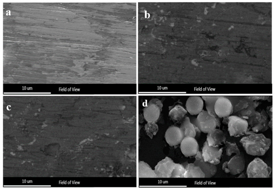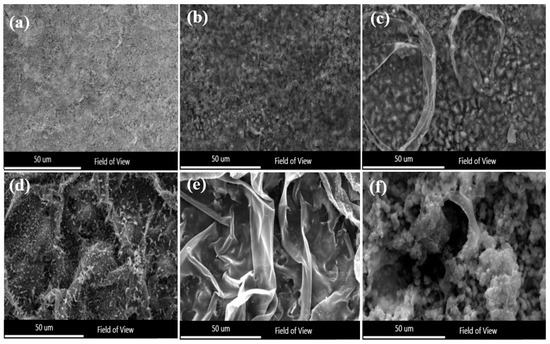 The morphologies of the amorphous coatings surfaces at varying temperatures after electrochemical analysis are shown in Figure 6. As shown in Figure 6b, the amorphous coating did not suffer from pitting corrosion and featured morphologies close to the pre-testing morphologies, shown in Figure 6a. Although pitting occurred as the temperature increased, it exhibited general corrosion activity before the chromium was transpassively dissolved [9]. The number of pits increased dramatically when the solution temperature exceeded 50 °C. Furthermore, the density followed the same pattern. In addition, the pit shapes (the diameter of the pit increases) forming at 30 °C and 40 °C were different. As depicted in Figure 6e, when the temperature reached 60 °C, the pits became a deep depression in the ground and formed a massive hole with a visible lacy cover. As seen in Figure 6f, when the temperature reached 70 °C, the cover became finely perforated and consistent with a rugged interior and dish-shaped profiles. A pit is formed according to the following steps: first, early pit growth is hemispheric, with pit contents covered by perforated residue from the passive film. The pit cover is then broken when it approaches a critical height, leaving an exposed hemispheric cavity. Even if passivation is not a problem, the open hemisphere-shaped pit cavity is a temporary form as the rising pits transform into saucer-shaped cavities under anodic diffusion regulation.