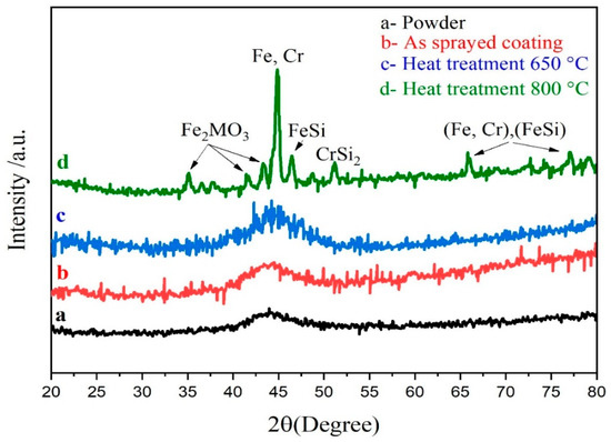 X-ray diffractometer (XRD) spectrum of (a) powder, (b) as-sprayed coating, (c) coating specimens by heat treatment at 650 °C for 4 h and (d) 800 °C for 4 h.