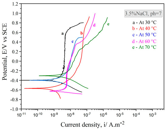 Potentiodynamic polarization curves of the Fe49.7Cr1.8Mn1.9 Mo7.4W1.6B15.2C3.8Si2.4 coatings deposited under the conditions of 30 °C, 40 °C, 50 °C, 60 °C, and 70 °C in 3.5% NaCl solution.