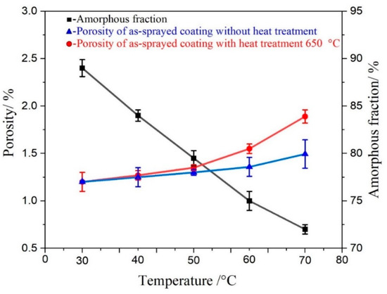 Comparison of the porosity and amorphous phase fraction of the coatings deposited under the conditions of 30 °C, 40 °C, 50 °C, 60 °C and 70 °C.