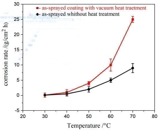 Relationship between temperature and corrosion rate of as-sprayed coating with vacuum heat treatment at 650 °C and as-sprayed coating without heat treatment.
