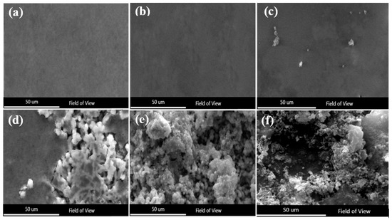 SEM images of pitting formed on the samples after test: (a) as-sprayed coating, (b) 3.5% NaCl, 30 °C, (c) 3.5% NaCl, 40 °C, (d) 3.5% NaCl, 50 °C, (e) 3.5% NaCl, 60 °C, (f) 3.5% NaCl, 70 °C.