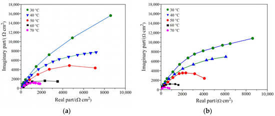 (a) Nyquist plots of as-sprayed coating in 3.5% NaCl solution; (b) Nyquist plots of coating (without vacuum heat treatment 650 °C) in 3.5% NaCl solution.