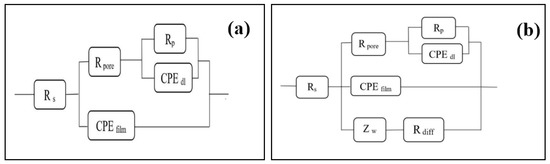 Equivalent circuits proposed for fitting of EIS plots: (a) model for single corrosion mechanism of pitting corrosion; (b) model for double corrosion mechanism of pitting corrosion.