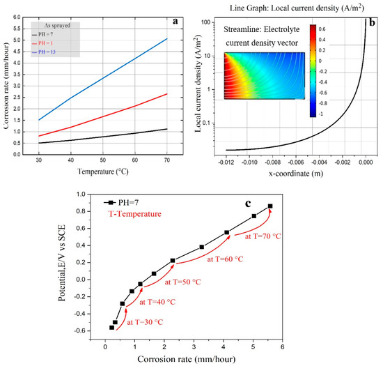 The model was developed in COMSOL Multiphysics version 5.5 software with a specific electrolyte domain to investigate the corrosion rate of the amorphous coating under various temperatures in 3.5% NaCl solution, as shown in Figure 11a. The model can be used with the experimental results, as indicated in Figure 11c, to demonstrate the amorphous coatings’ galvanic corrosion prediction. An increase in temperature and concentration increases the critical current density while having little effect on Ip and Epp. The addition of chloride ions to the Fe49.7Cr18Mn1.9Mo7.4W1.6B15.2C3.8Si2.4 amorphous coating has a similar effect. It can be observed that higher temperatures can aggravate metal corrosion. Corrosion can be exacerbated by elevated acidity and peroxide value following oxidation. Figure 11b reveals the influence of the disc radii on the local current density for coating. It can be observed that as the disc radius increased, the local current density increased. This may be attributed to corrosion dimensional expansion in the amorphous coating electrode. This influence, on the other hand, would be visible from the edges, so the local current density dropped drastically when approaching the disc boundaries. The findings revealed that flaws or edges are possible corrosion initiation points. Furthermore, the streamline of the electrolyte current density for the coating surface can be observed. Since the Nernst equation states that the equilibrium potential for oxygen reduction is dependent on pH, the general equation for pH = 7 in this model is: