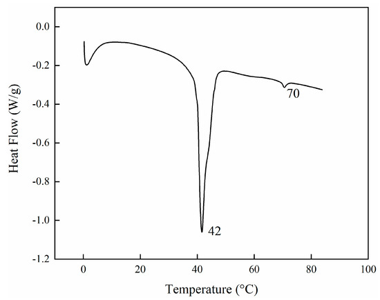 DSC profiles of LC monomer mixture melting when the initiator is absent. The thermogram corresponds to the first heating and shows two main endothermic transitions, the first at 42 °C and the second one at 70 °C.