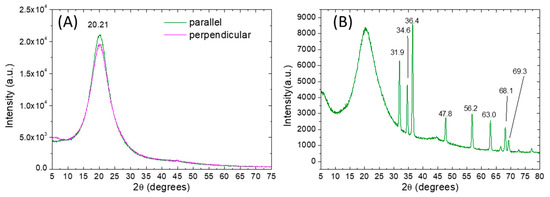 Crystalline reflections of the starting monomers are not visible in the diffractograms of bare (Azo-LC-PMP) and doped PMP (Azo-LC-PMP(6%_Z)) films showing a complete polymerization for both formulations (Figure 3A,B). Indeed, independently from the orientation of the samples, all polymer spectra present a large peak at about 2θ of 22° associated with polymer chains in an amorphous state. Moreover, for Azo-LC-PMP(6%_Z) the amorphous spectra of the polymer were partially overlapped with the many, strong and narrow crystalline peaks of the ZnO nanoparticles. The peaks were centered at 31.9°, 34,6°, 36.4°, 47.8°, 56.2°, 63.0°, 66.6°, 68,1°, 69,3° corresponding to the lattice planes (100), (002), (101), (102), (110), (103), (112), (112) and (201) of the wurtzite structure of ZnO.