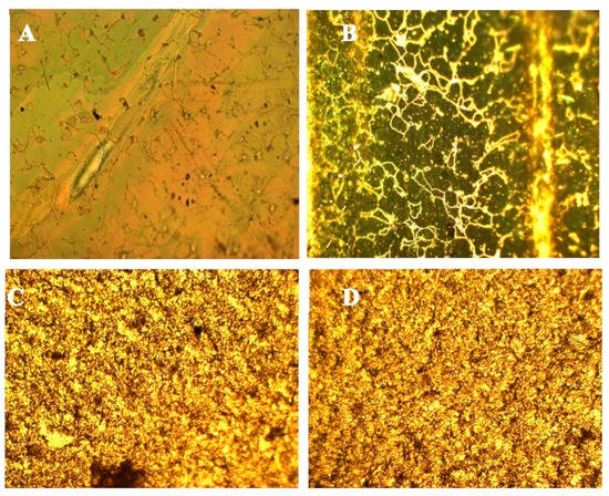 Later, the PMPs were analysed with a polarized light microscope to find out if the nematic phase was stored after polymerization. The objective used was 10×, and the film was set both at 45 degrees and parallel to one of the two polarizers. The Azo-LC-PMP showed a well-defined property of rotation of polarized light (Figure 4A,B). This was confirmed by measuring the power of the light observed when the samples were rotated at different angles with respect to the two polarizers. A maximum transmission was measured when the cell was tilted of 45 degrees (Table 1). This result is an indication that our procedure allowed the synthesis of crosslinked films that have orientational ordering of the LC moieties.